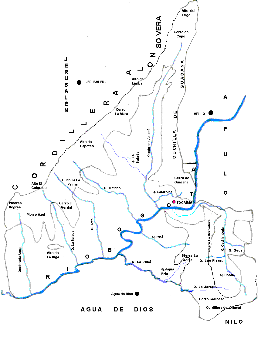 HIDROGRAFÍALa hidrografía de Tocaima, con excepción de las quebradas Grande y El Tabaco que vierten sus aguas al Río Seco, pertenece a la cuenca del río Bogotá que parte en dos al territorio. A él confluyen las quebradas de Acuatá, Cachimbula, Puná, Isná, La Ardita, Catarnica, y otras menores como San Juanito y La Honda. Otras quebradas de menor caudal son: La Jaramilla, La Mojana, Agua Fría, San Pablo, El Salitre y Santa Rosa. En Copó, las quebradas Grande y El Tabaco, vierten sus aguas al Río Seco. En la mayoría de las veredas, existen nacederos de agua, algunos de los cuales se han secado por la deforestación abusiva del hombre. El río Bogotá vierte sus aguas al río Magdalena en Girardot.